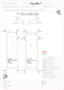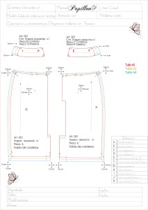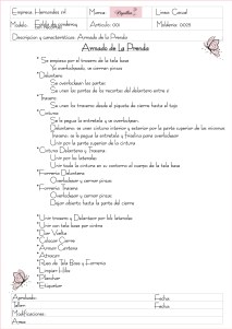 A continuación se diagrama la moldería de toda la prenda con sus respectivos nombres y características para llevar un detallado archivo de la misma y para que no se pierdan los datos. Se hacen todas las especificaciones posibles y necesarias para que la modelista o tallerista entienda la moldería y la prenda.
