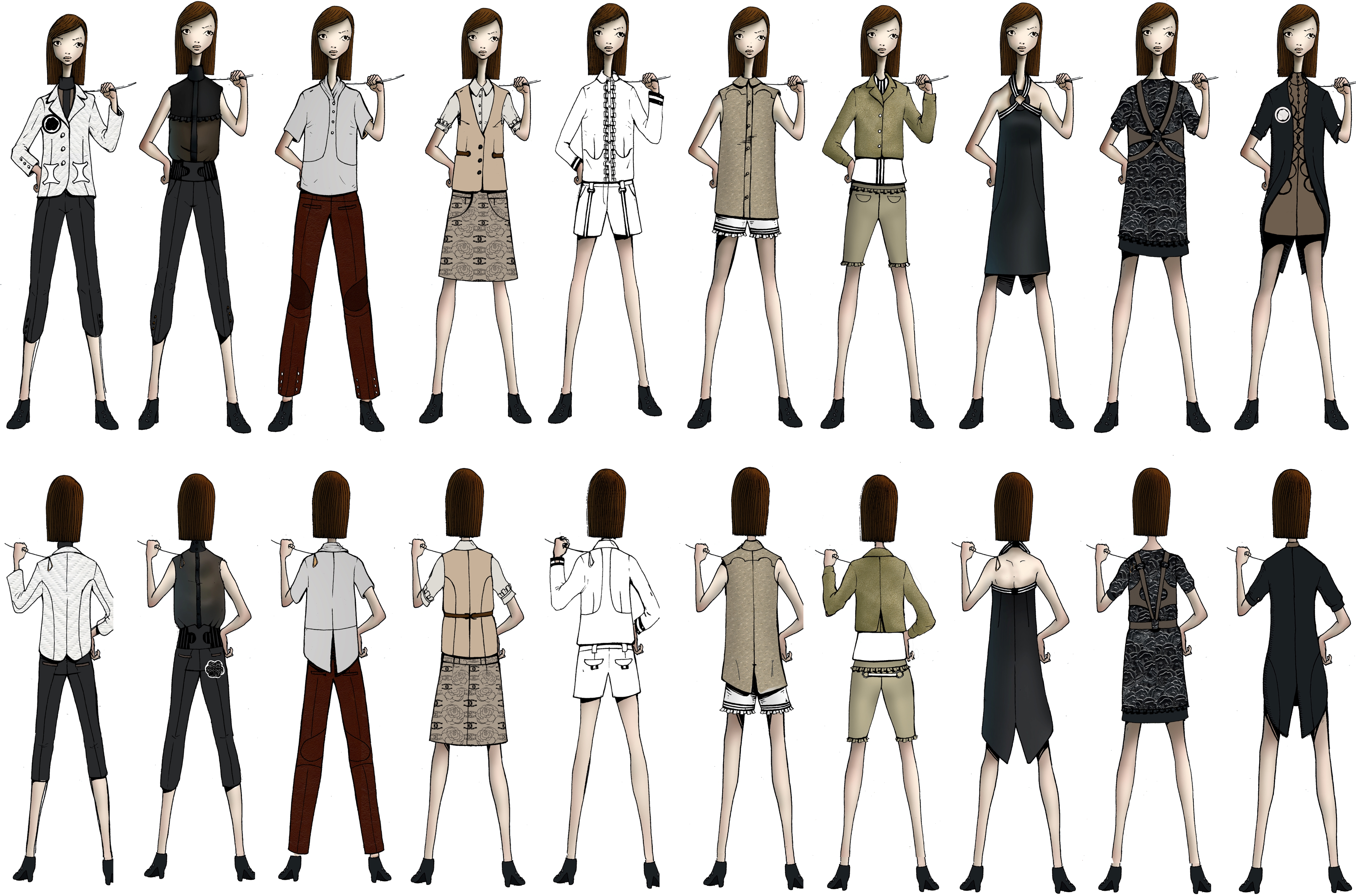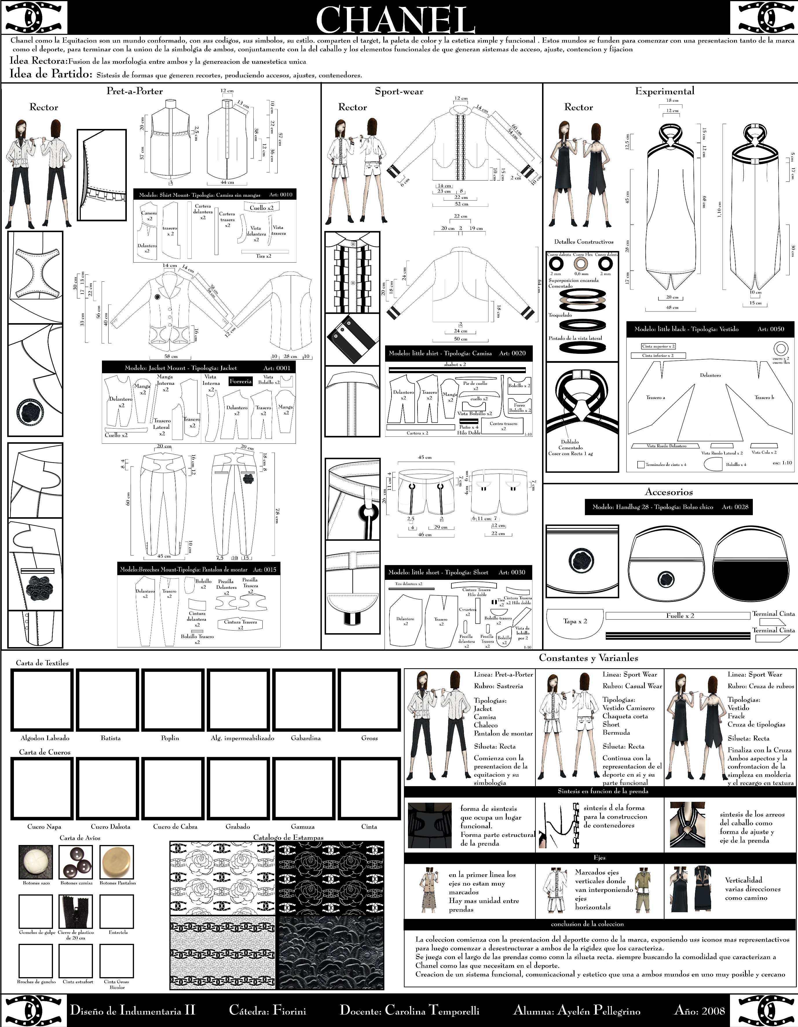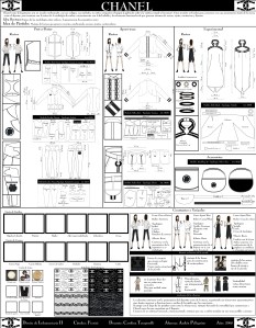 Panel tecnológico y funcional con las instrucciones precisas de construcción y armado de las prendas y los detalles constructivos.