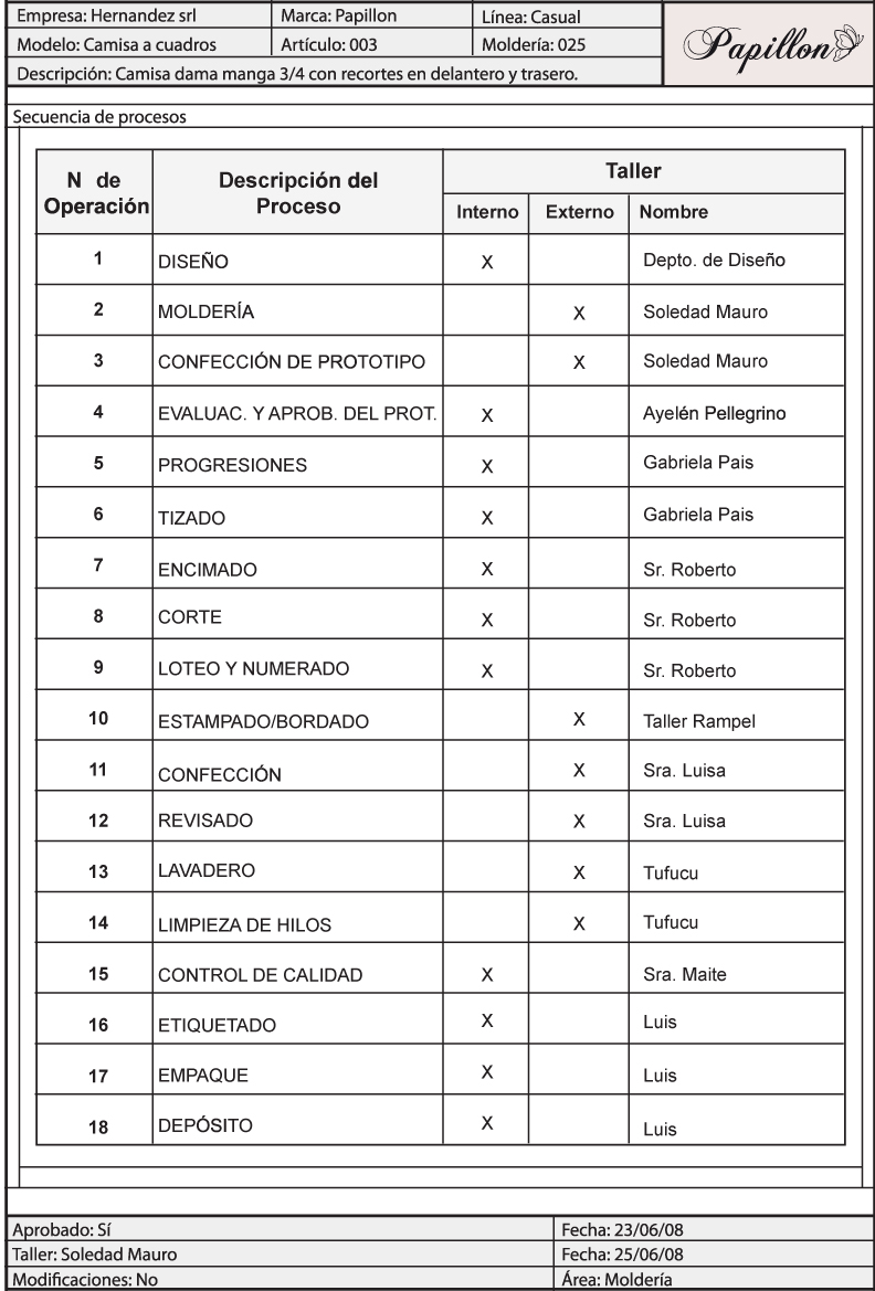 Se realiza una lista de los procesos que tendría ese producto en su camino, desde el diseño hasta el depósito, para llevar un orden de los mismos, tener una cronología, un seguimiento y control de los responsables de cada área.