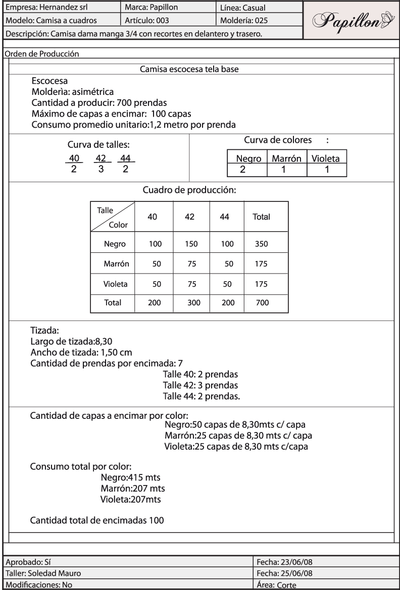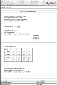 Se detalla la tizada, la cantidad de encimadas, el consumo total por color y el total de encimadas, tanto en tela base como en entretela.