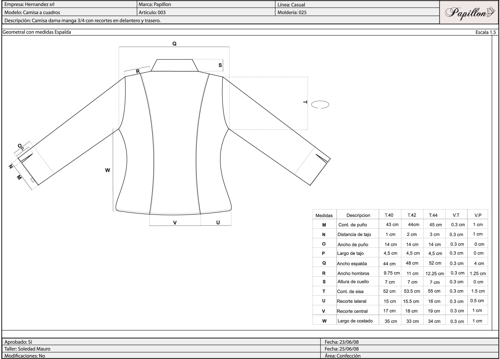 Geomtral Espalda con tabla de medidas.
