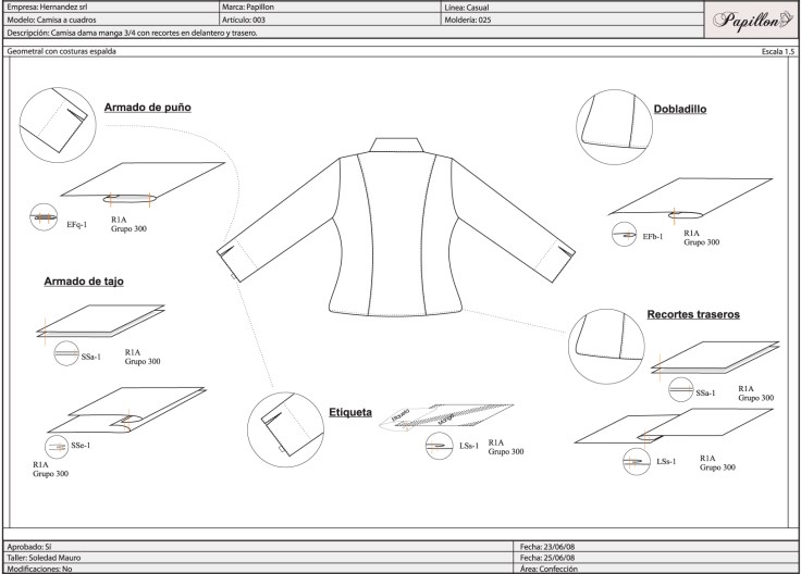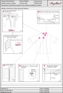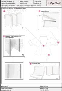 Desarrollo industrial de una camisa de mujer manga 3/4 con recortes en delantero y trasero.