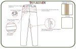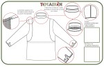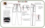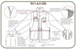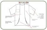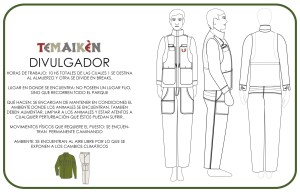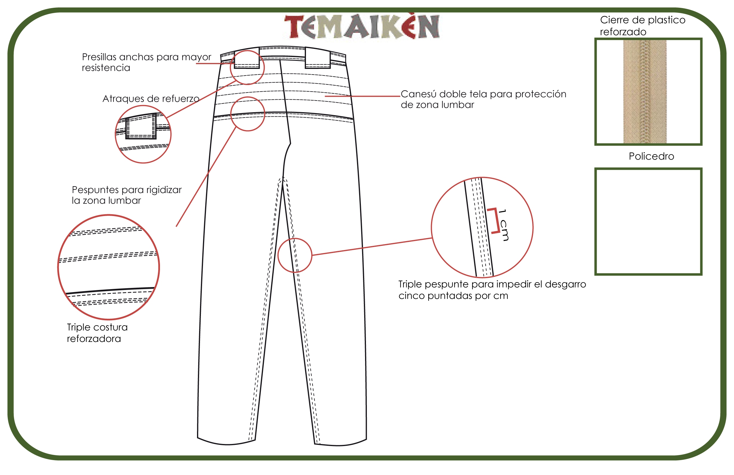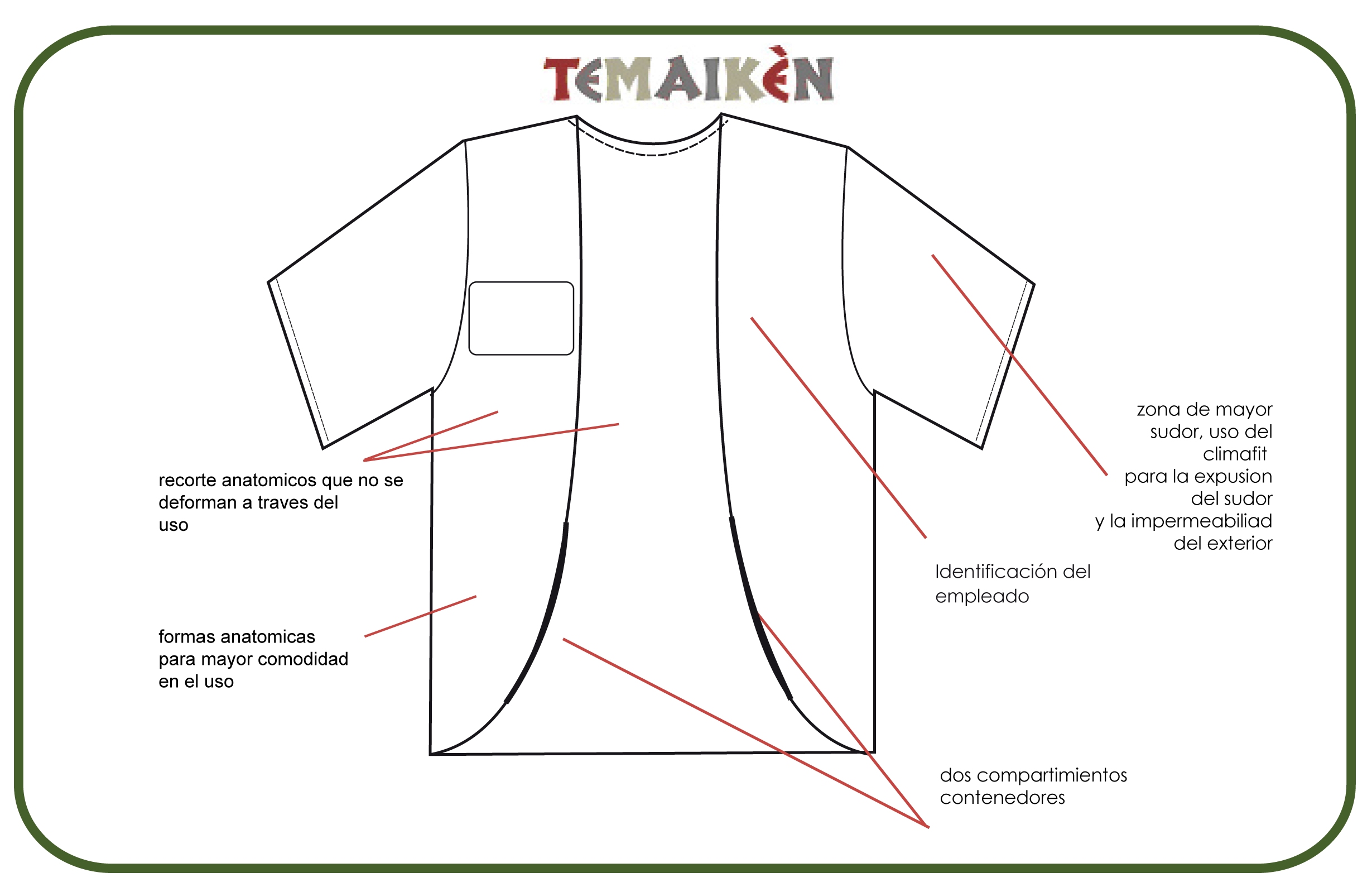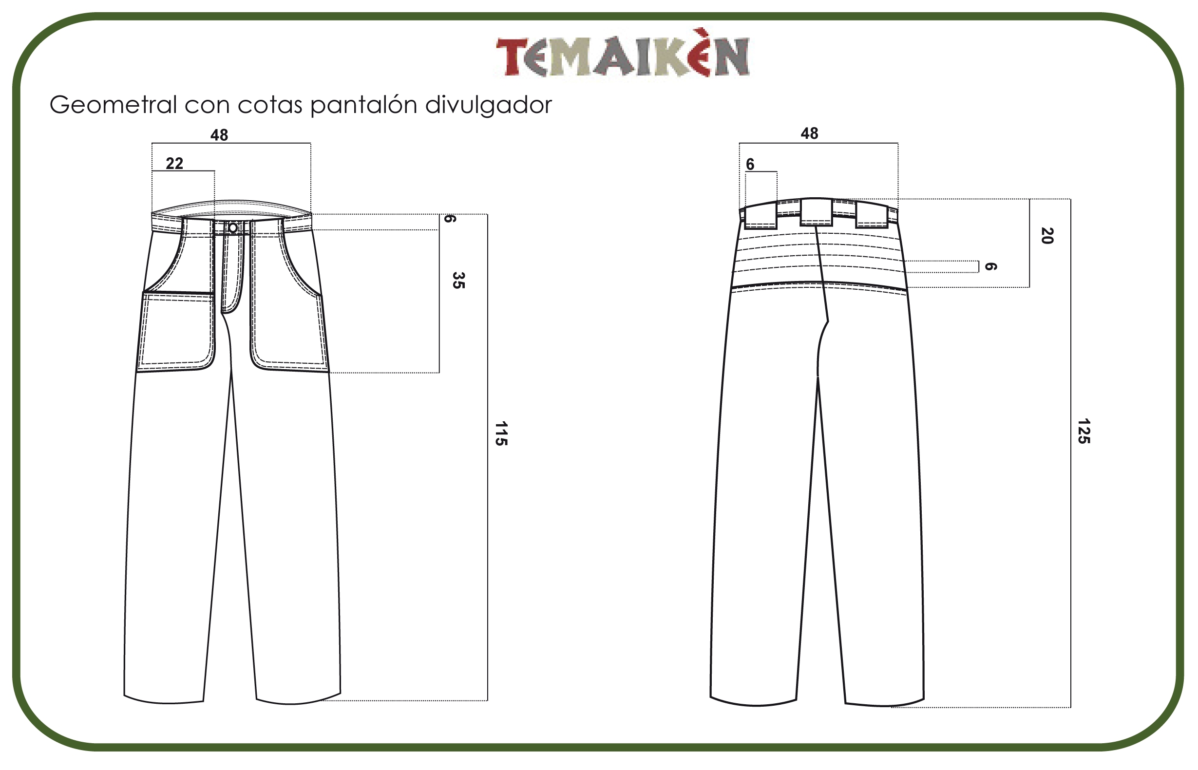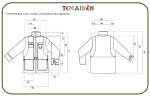 Geometrales explicativos de frente y espalda de las prendas que integran el conjunto. Explicación de sistemas, muestras de materiales y avíos.