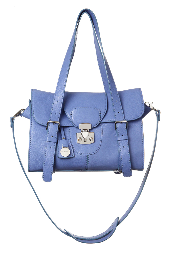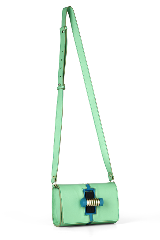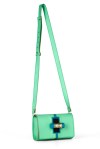 Clase 6. Bandolera pequeña, cruzada, manija fina y chata con hebillas que la regulan, fuelle piramidal, bolsillo en molderia, con vivo en fuelle y base