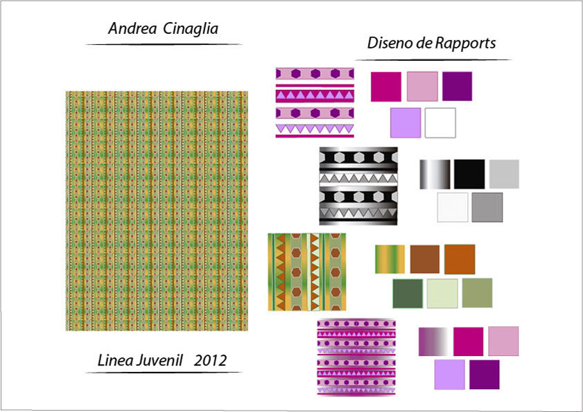 Un año completo de trabajos y proyectos, un porfolio amplio con diversas técnicas, buscando un estilo propio y perfeccionando detalles y recursos. El porfolio de Andrea se tiñe con motivos, estampas y rapports, consagrando un trabajo de diseño de indumentaria y textil completísimo.