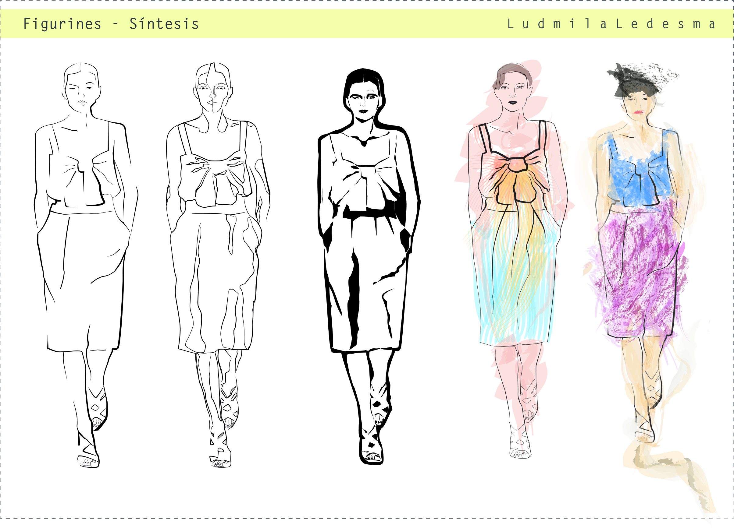 Síntesis del cuerpo vestido: linea modulada, linea quebrada, envolventes, negativo. Técnicas de pintado digital imitando procesos manuales como la acuarela y el oleo pastel