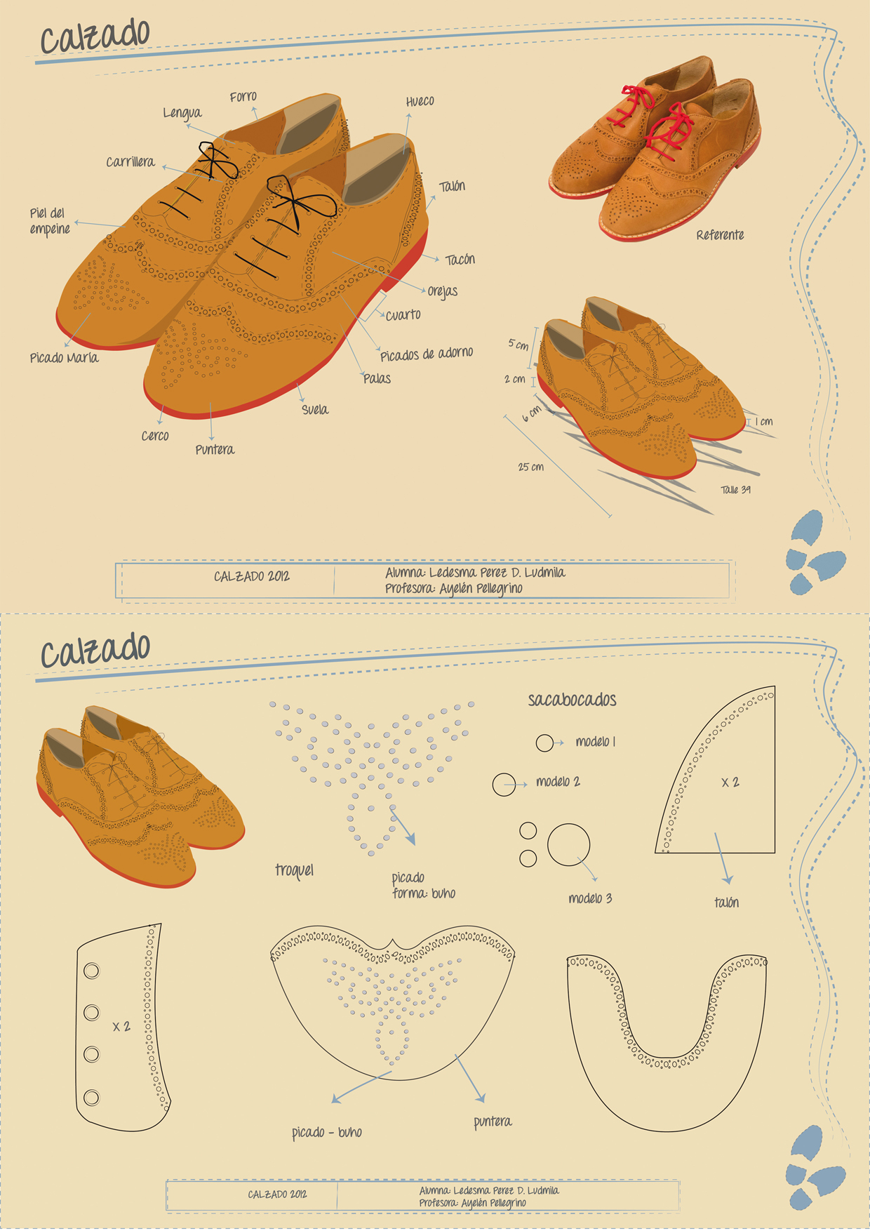 Ficha técnica de calzado, ilustración del calzado en perspectiva con enumeración de cada una de sus partes, medidas principales y despiece de molderia para su corte con troquel o laser.