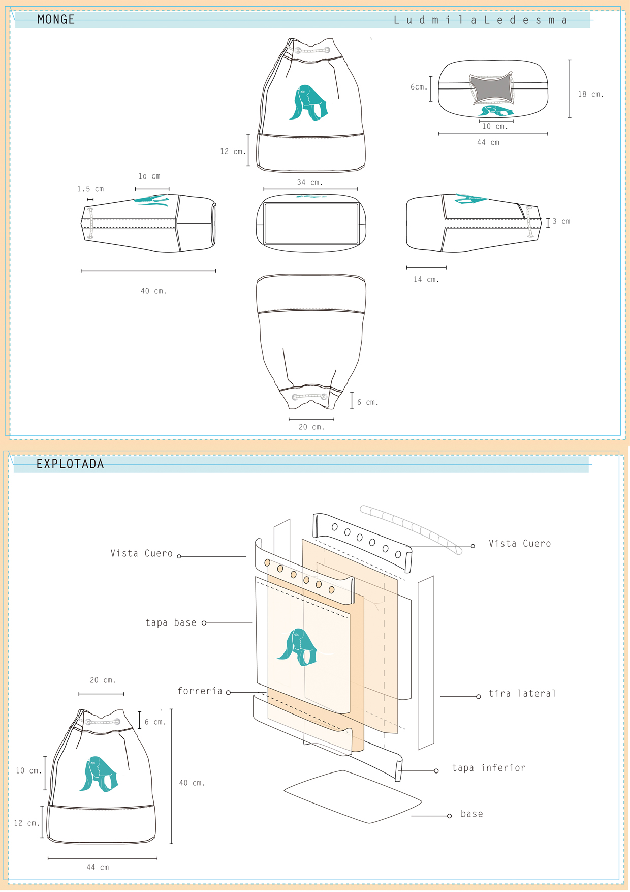 Ficha técnica de marroquinería con sistema monge y cotas de medidas. Explotada del despiece de moldería para la correcta ubicación de las piezas en el armado.